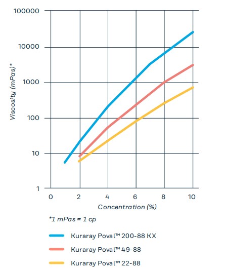 At the same concentration, the viscosity of solutions with different molecular weights of PVOH varies significantly. However, in actual coating, the extended viscosity behavior as a function of concentration is more important.