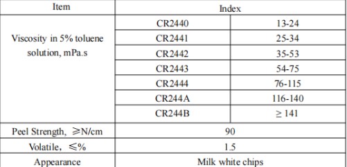 Its appearance is off-white or beige flakes, with a stable density of around 1.23. In terms of technical indicators, CR244 offers a very finely divided viscosity range. From the ultra-low viscosity CR2440 (13-24 mPa.s, 5% toluene solution) to the high-viscosity CR244B (above 140 mPa.s), this wide viscosity coverage allows adhesive manufacturers to precisely adjust the formulation solid content according to the needs of brushing, spraying, or scraping processes.