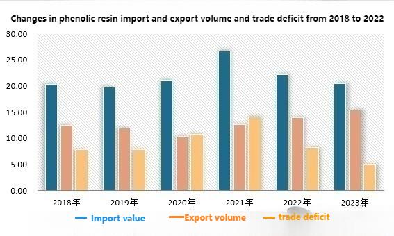 Data menunjukkan bahwa dalam beberapa tahun terakhir, negara saya telah mengimpor lebih dari 80.000 ton resin fenolik per tahun, terutama resin fenolik kelas atas, mencapai 86.000 ton pada tahun 2023, sedikit meningkat 0,94% dibandingkan tahun sebelumnya. Ekspor tetap di atas 90.000 ton, mencapai 125.100 ton pada tahun 2023, meningkat 18,69% dibandingkan tahun sebelumnya. Karena nilai tambah resin fenolik kelas atas yang tinggi, volume impor dan harga impor rata-rata resin fenolik negara saya selalu lebih tinggi daripada volume ekspor dan harga ekspor rata-ratanya. Data menunjukkan bahwa sejak tahun 2021, volume impornya menurun dari tahun ke tahun, tetapi volume ekspornya menunjukkan tren pertumbuhan tahunan, masing-masing mencapai 2,045 miliar yuan dan 1,542 miliar yuan pada tahun 2023, yang masing-masing menurun 7,76% dan meningkat 10,94%. Dengan penurunan volume impor resin fenolik dan peningkatan volume ekspor, defisit perdagangannya menunjukkan tren menyusut sejak 2021, turun menjadi 503 juta yuan pada tahun 2023.